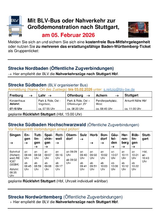 Anreisekosten mit Bussen bzw. Gruppenfahrscheine des VVS und der Bahn werden unseren Mitgliedern auf Nachweis erstattet. Außerdem hat der BLV eigene Buslinien eingerichtet – sollten Sie diese nutzen wollen, so melden Sie sich bitte entsprechend den Hinweisen auf dem Aufruf-Flyer (QR-Code) oder der Anlage „Anfahrt zur Großdemo“ an. Voraussetzung für die Erstattung von Reisekosten und Streikgeld ist die Eintragung in die Unterschriftenlisten des BLV vor Ort.