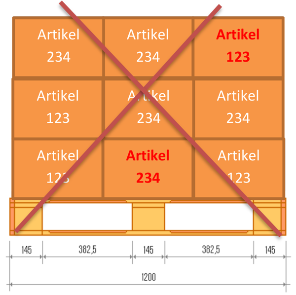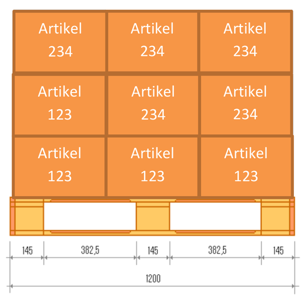- Bei Misch-Paletten müssen die Umverpackungen von gleichen Artikeln wie folgt auf der Palette angeordnet werden.